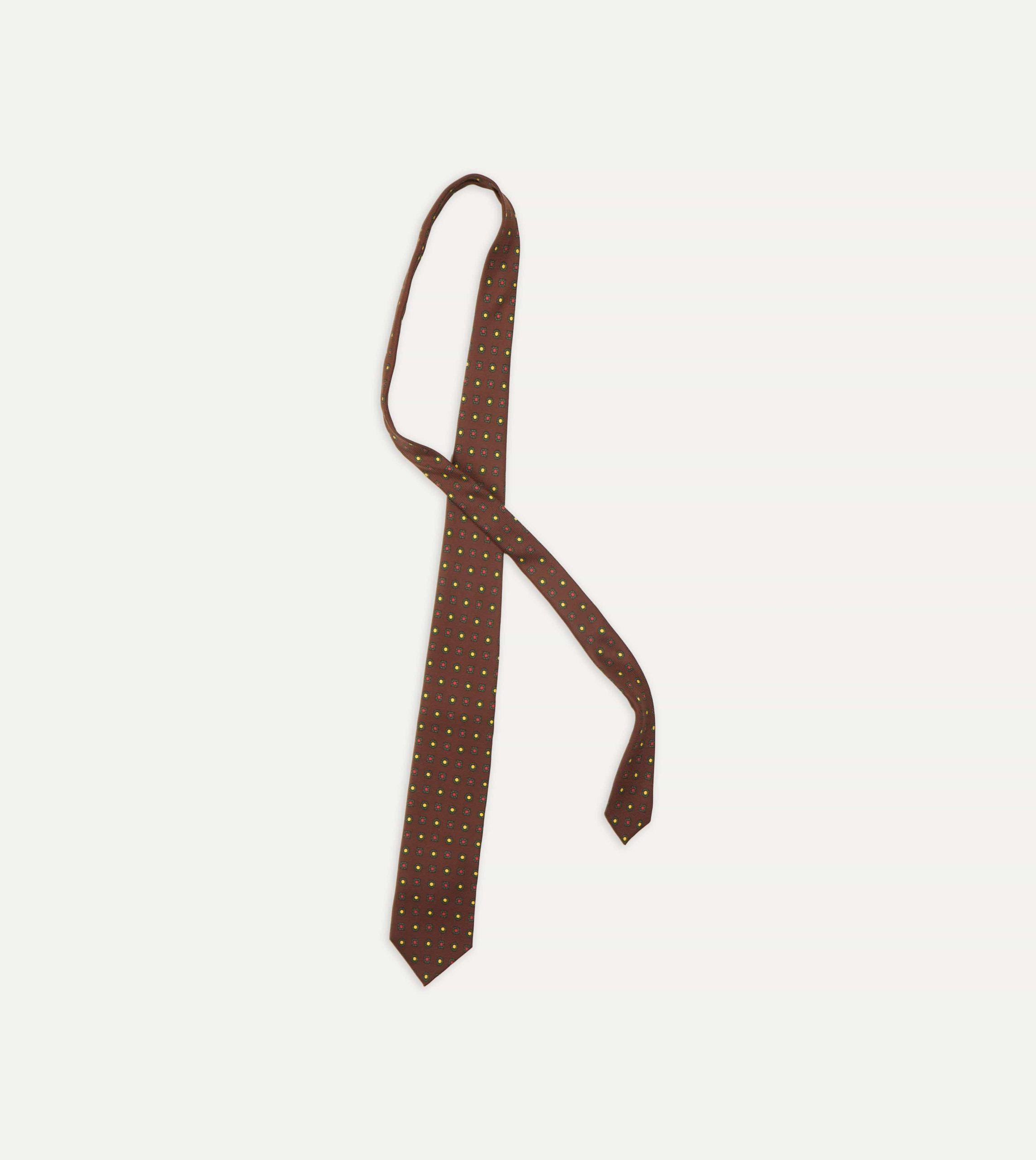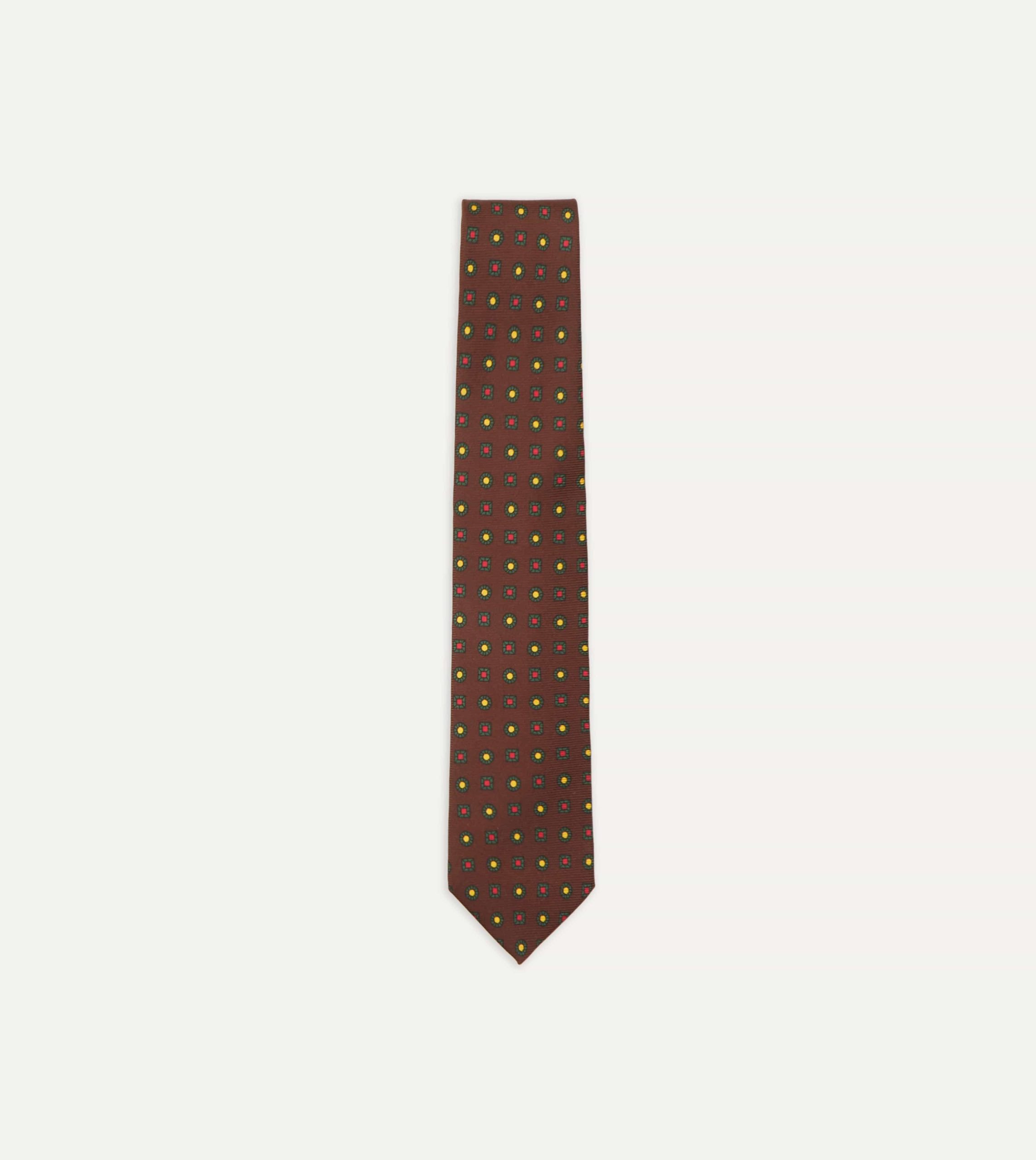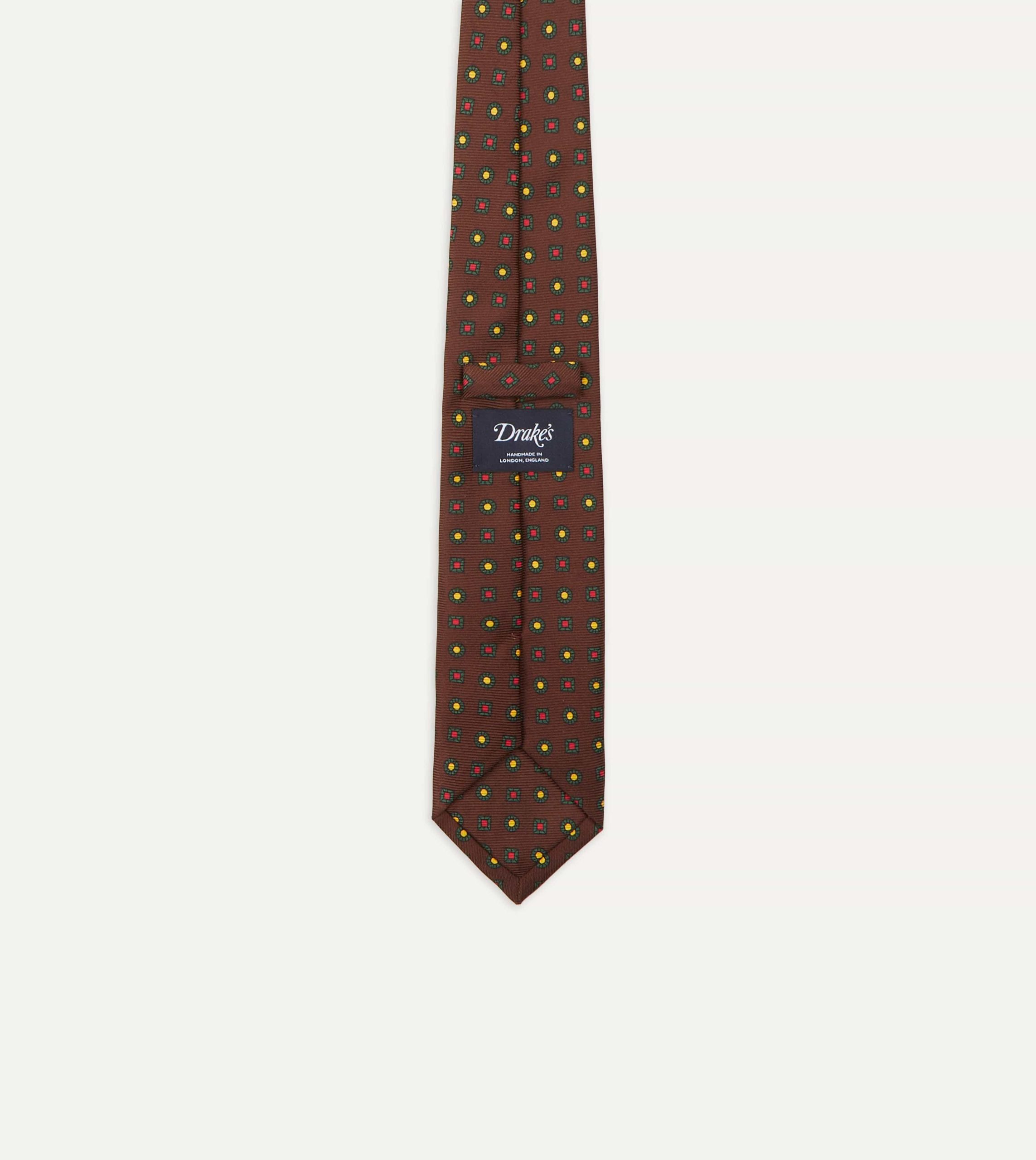 Brown and Green Geometric Medallion Print Madder Twill Silk Tie