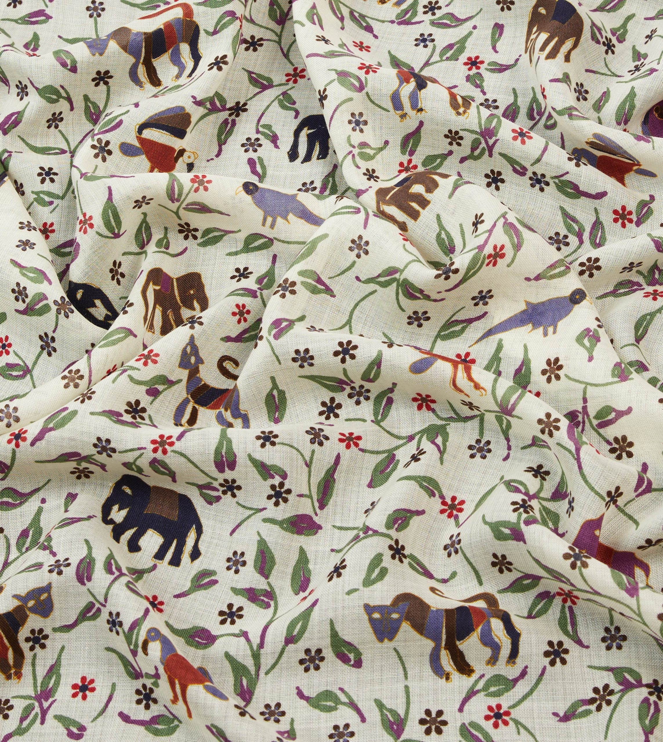 Taken from our extensive design archive. this elephants and flowers motif has been vividly applied to a blend of pure wool and silk. perfect for introducing a subtle and sophisticated dash of pattern to one’s ensemble.