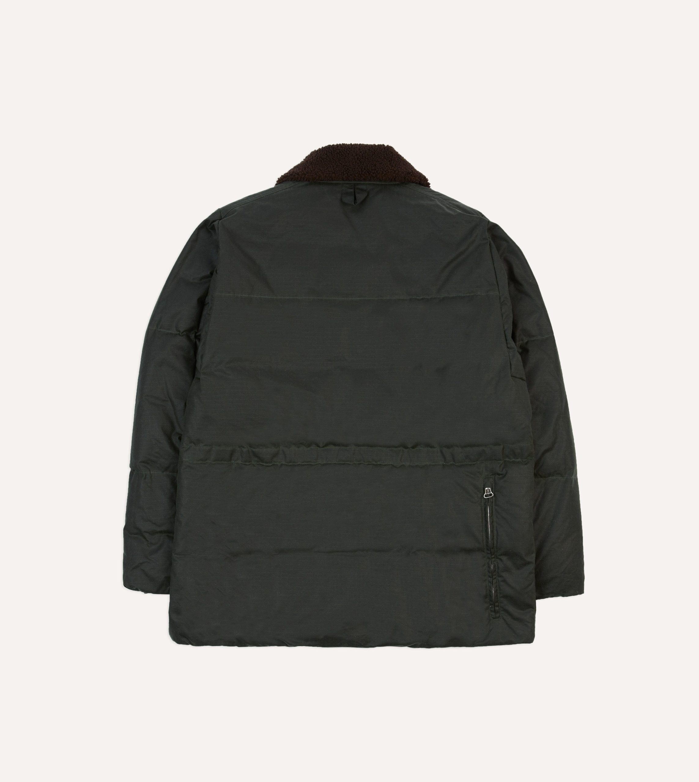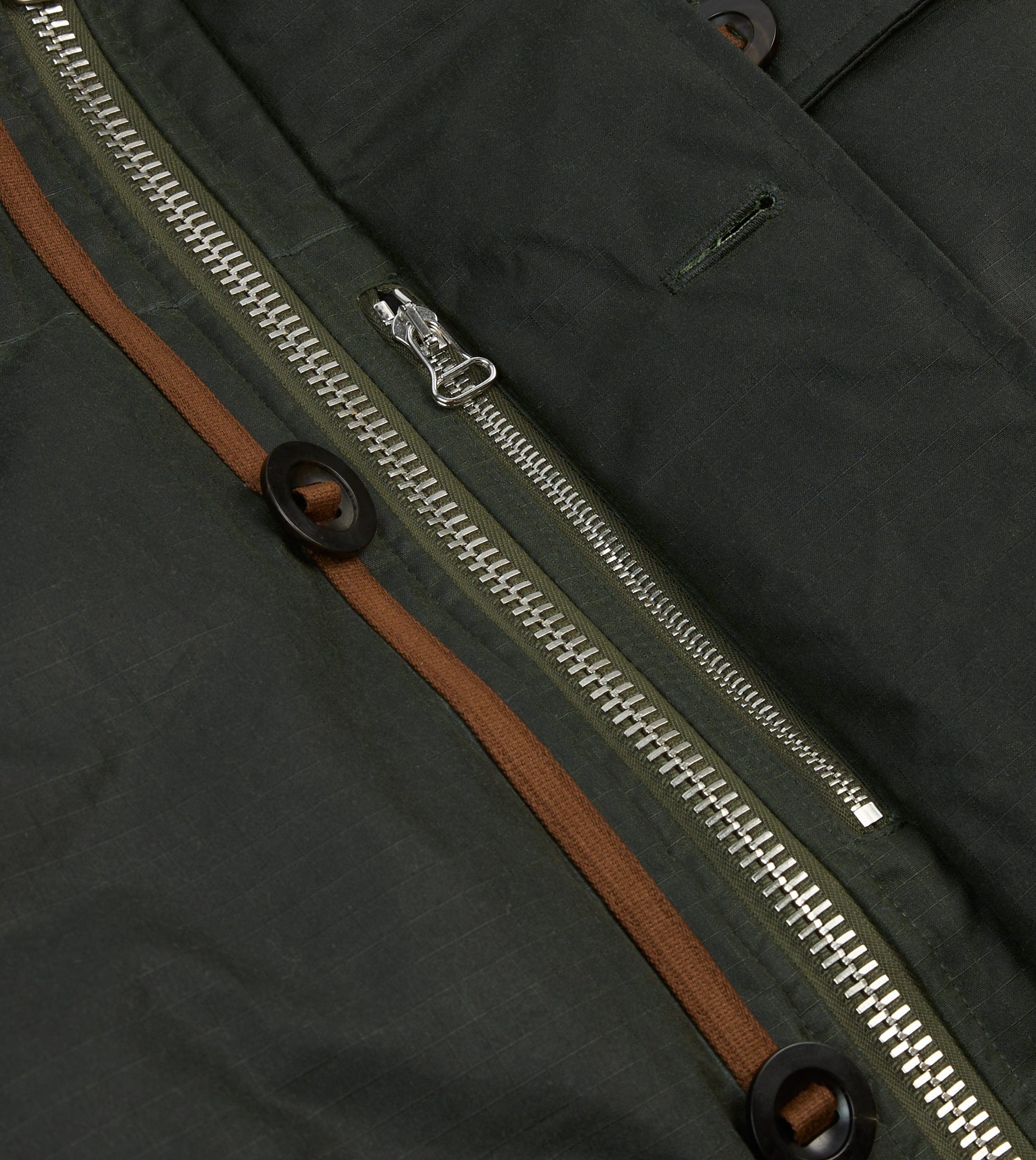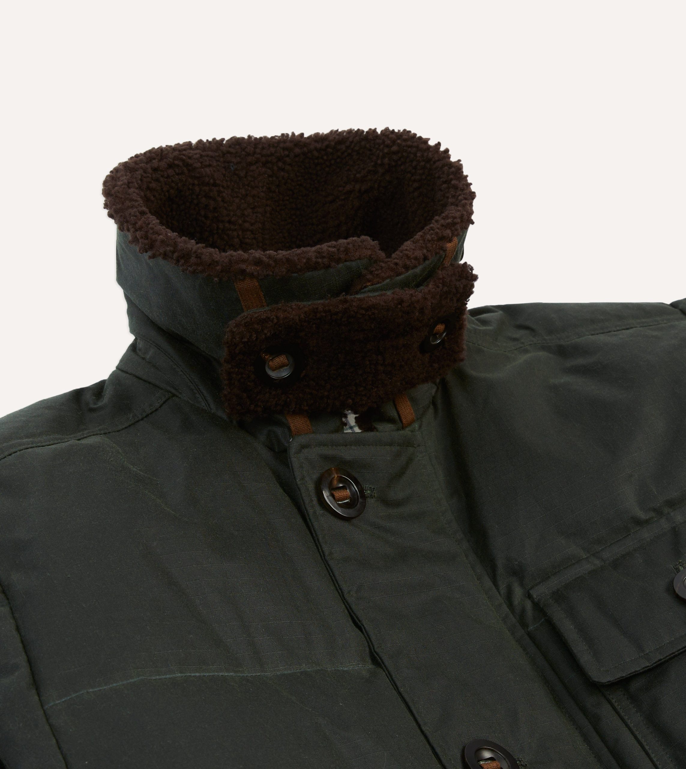 A sporty piece of outerwear with an undeniably rugged charm. this expedition parka takes its cues from hiking and mountaineering clothing. Generously down-filled to create a pleasingly voluminous effect. the parka is finished with chunky horn buttons. two-way zip. drawstring waist. shearling collar. two-way hip pockets. and a single chest pocket.