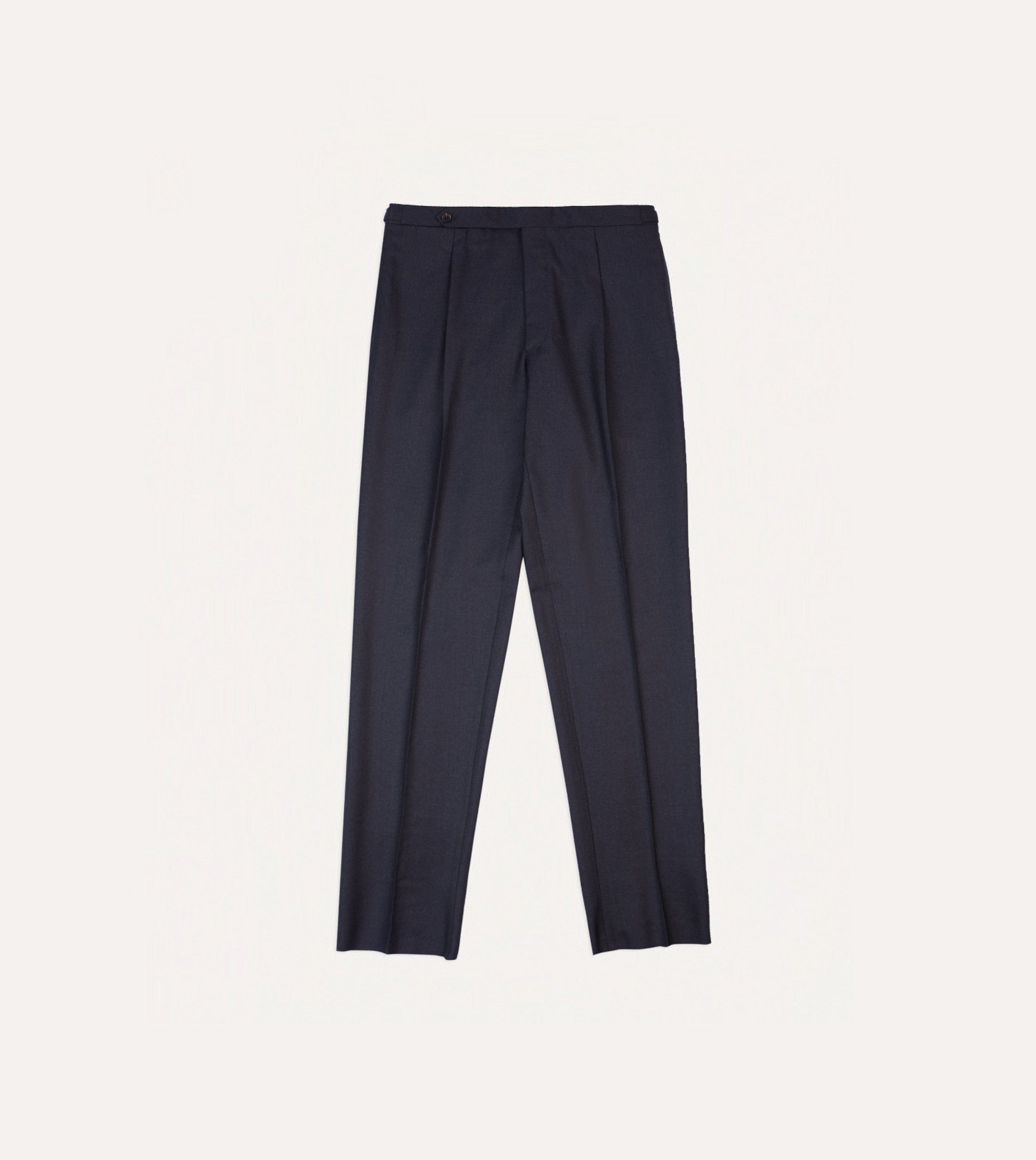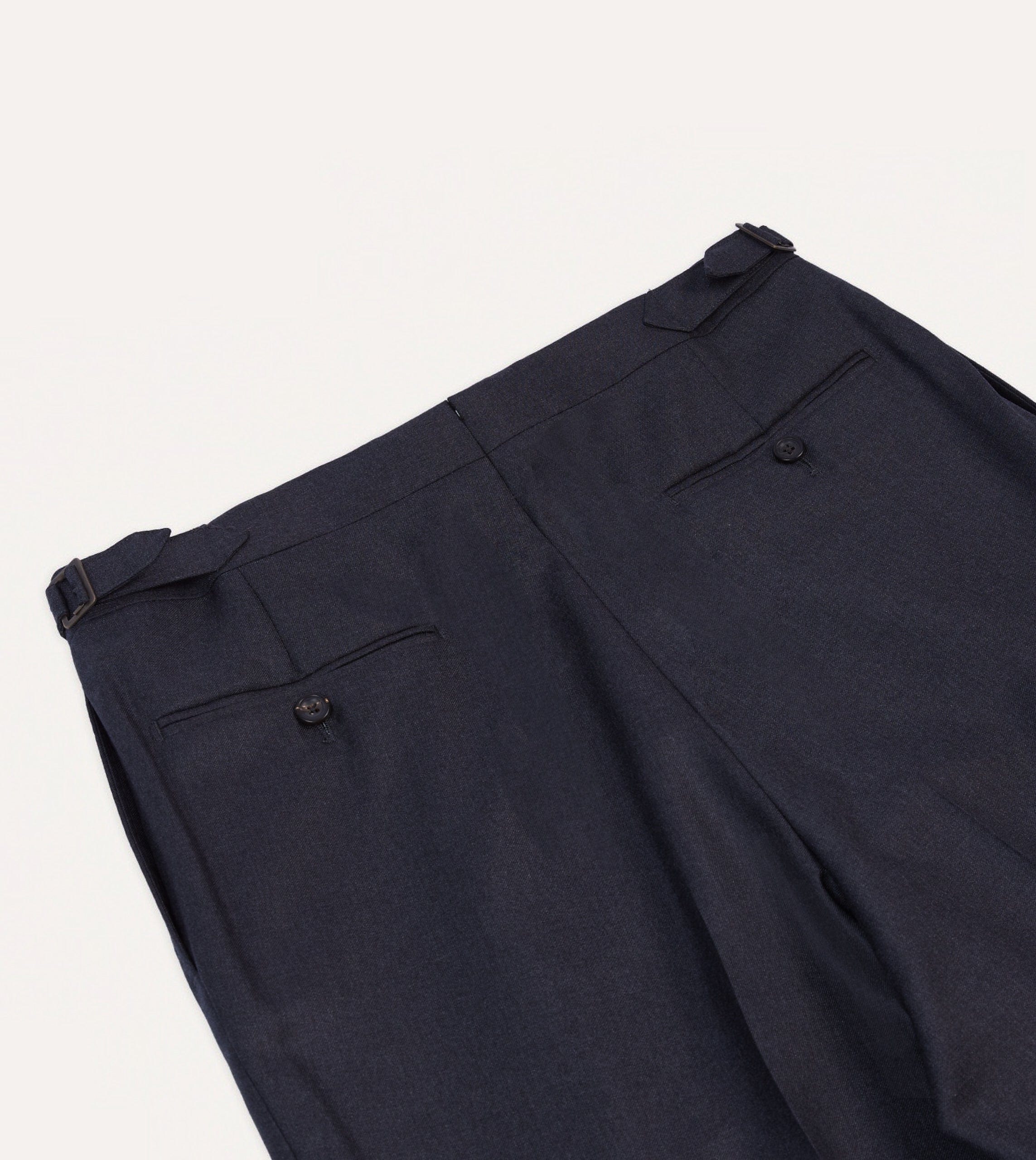 Crafted from a worsted merino wool. the half-lined trousers feature understated details such as an extended tab front. French bearer buttoning with interior waistband curtaining. an after-dinner split to the rear. and a prong keeper for securing a belt buckle.