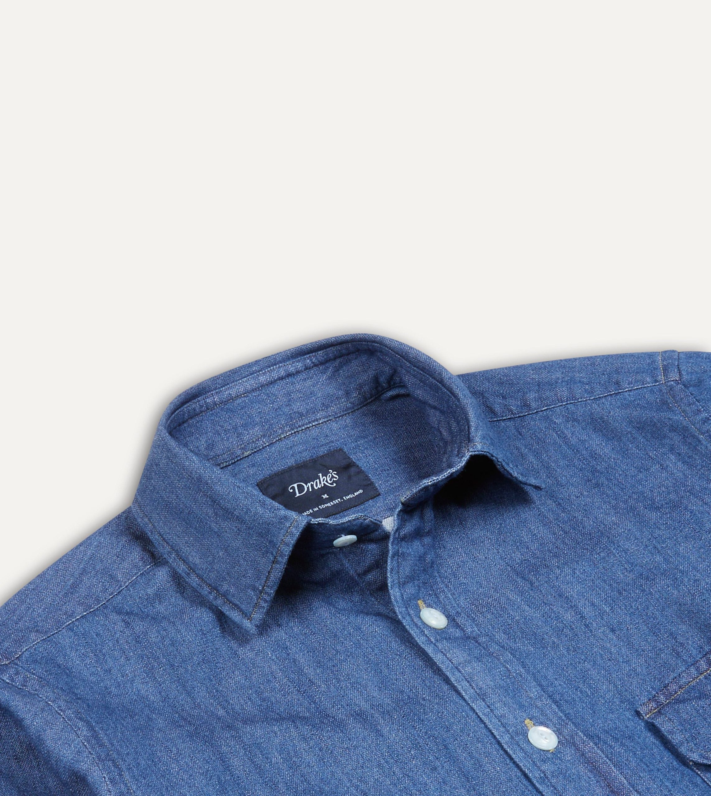 Our two-pocket work shirt style returns. this time cut from a wholesome mid-blue denim. which will fade and patinate satisfyingly over time.