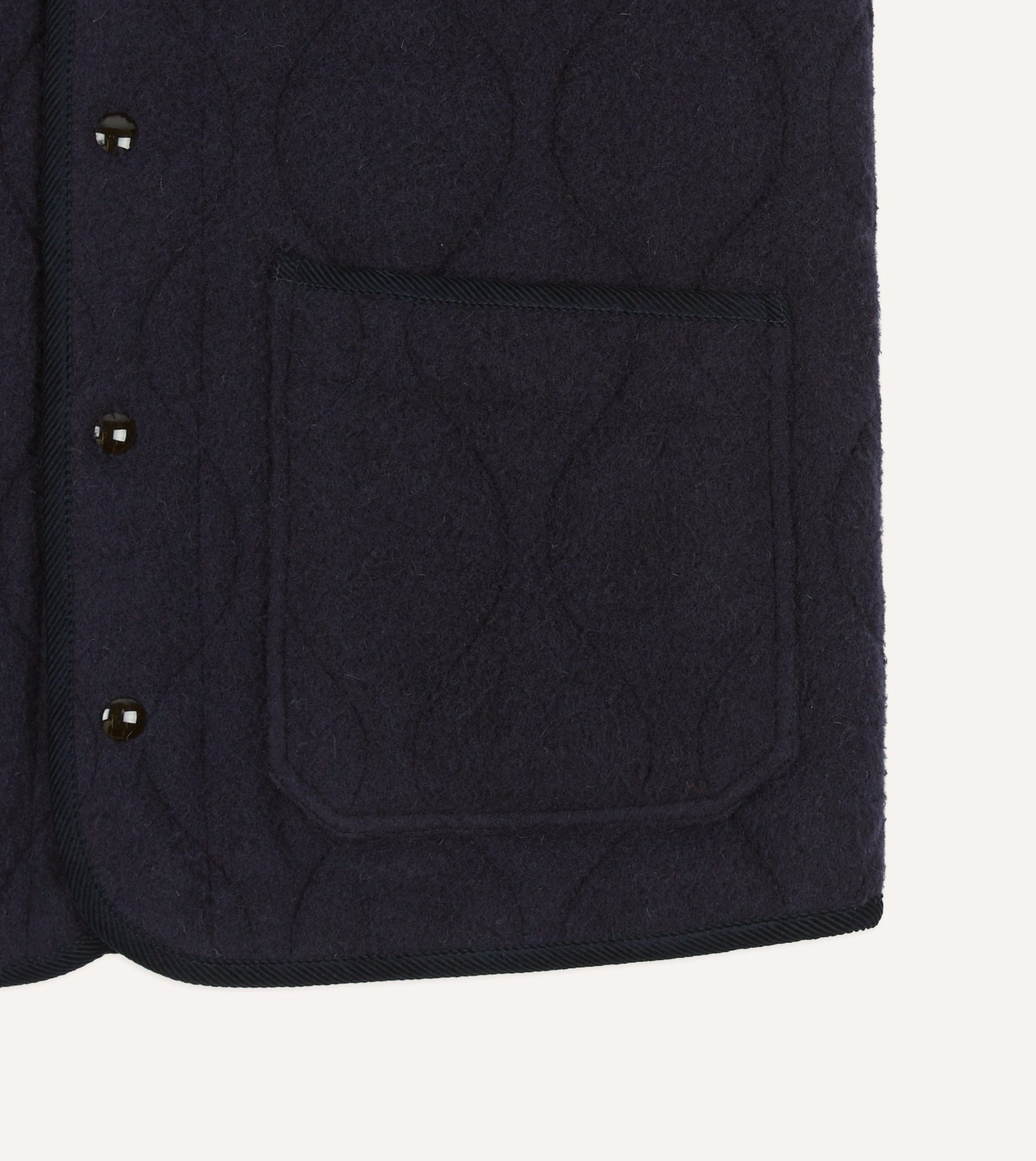 A sporty piece of outerwear with an undeniably rugged charm. this quilted vest takes its cues from hiking and equestrian clothing. Cut from a textured and storied Casentino wool. prized for its resilience and weather-proof properties. and generously wadded with recycled wool to create a pleasingly voluminous effect. the jacket is finished with five snap buttons. wide front pockets. and 14 wale corduroy piping.