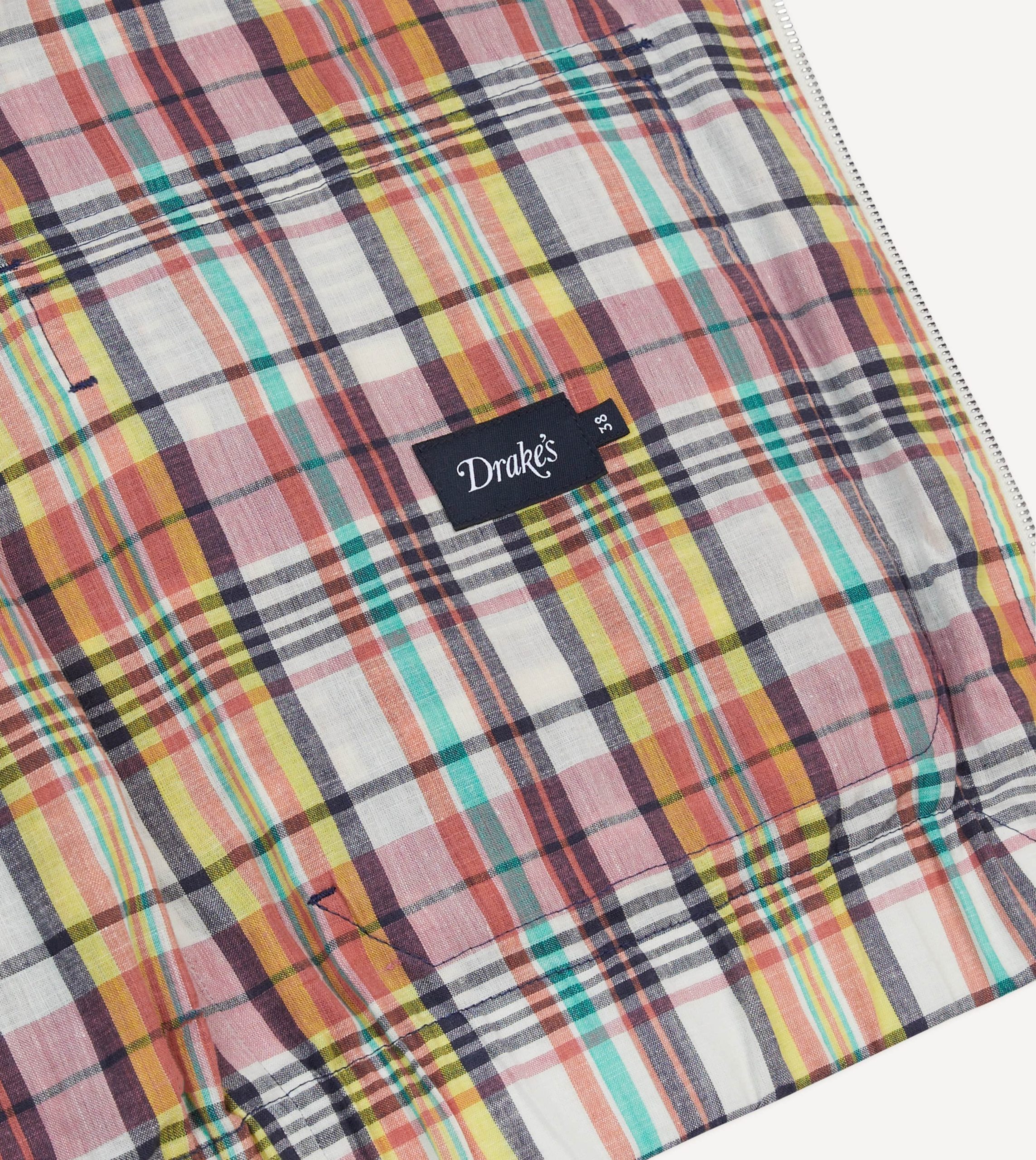 Cut from a waxed Madras fabric. this jacket has a short. slightly boxy shape which lends it a nostalgic silhouette. With an elasticated waist. adjustable cuffs and a double zip closure. it makes subtle nods to mid-century sporting attire as worn by Emerson. Laver. Ashe et al. in the 1960s.